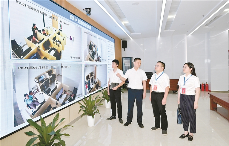 江西省南昌市紀委監委緊盯案件暴露出的招投標領域突出問題推動促改促治,督促有關職能部門優化硬件設施、嚴格日常監管、加強制度執行。圖為近日,該市紀檢監察干部在南昌公共資源交易中心音視頻見證終端電子屏幕前對交易過程進行抽查。 南昌市紀委監委供圖