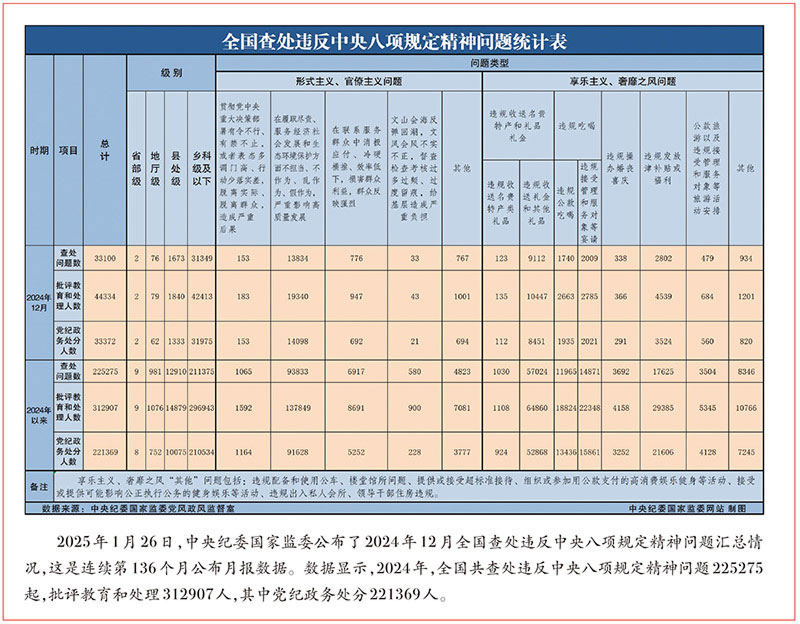 2024年,全國紀檢監察機關共接收信訪舉報356.3萬件次,處置問題線索217.5萬件,立案87.7萬件,處分88.9萬人,運用“四種形態”批評教育和處理214.8萬人次……
